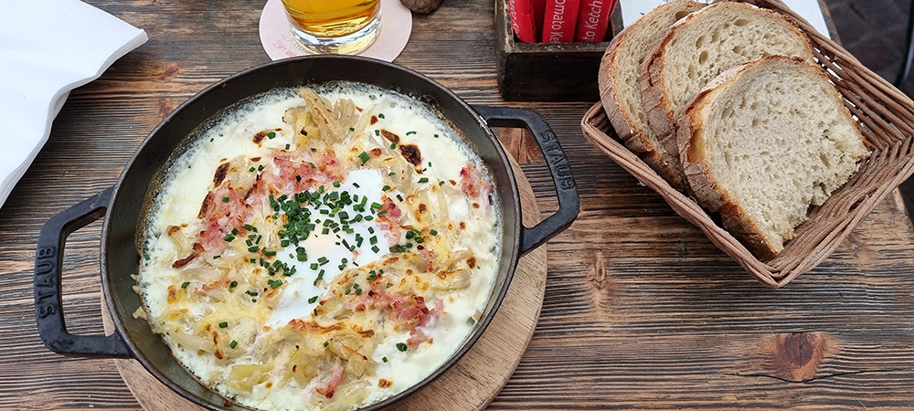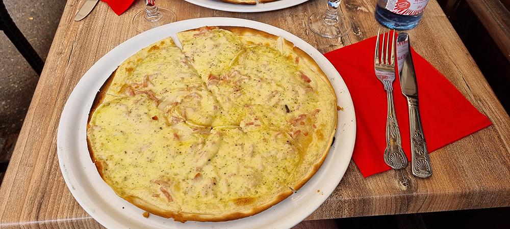 Mittagessen - Flammkuchen mit Ribeaupierre (Käse aus der Region)